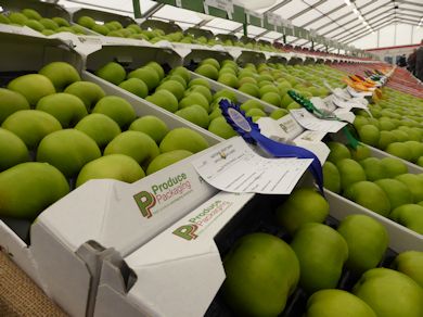 Below: left; the 'Worraker Bramley tree format' and right; award winning Bramley apples at the National Fruit Show