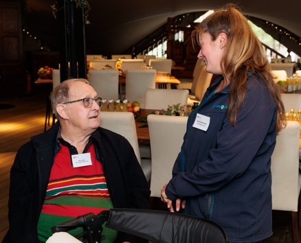 Below: Back from our orchard walk, we relax with a cup of tea. left. The EAM with Charnee Butcher of Worldwide Fruit and right. 'small group engaging in conversation'