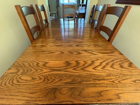 The 'cherished oak dining table' has wonderful 'back story' Soon after we married in 1963 and living on a farm workers wage circa £10 (gross) a week. My father came home very excited from a trip to obtain some spare parts for a piece of farm machinery, AND said: "the firm is closing and there is a wonderful old oak table, used until then as an office desk" Its beautiful, they only want 30 shillings for it (£1.50 in todays money) Initially my young wife said; "I don't want that old thing in my house! But she was very fond of my father and relented. So off I went in a van I hired for 30 shillings (30 bob) and collected the said table for a total outlay of £3.