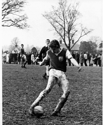 Below: left. Teenage brothers and right. 1965 and David at 19 years old scores his 4th goal in a charity cup final. We won 6-2
