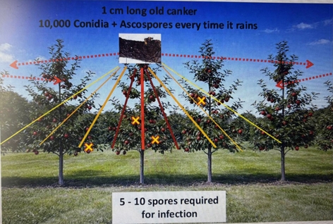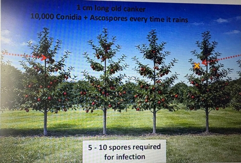 In the slides below, Matt illustrates the effect of canker spores in a tree and the benefit of limited canker in an orchard helping keep canker under control.