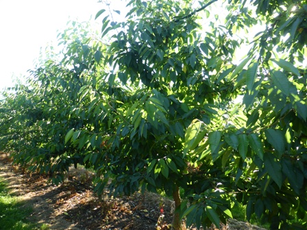 Ivan drew attention to the twin stem, where the tree was pruned to grow two upright leaders in a V formation; this is different to the true V format of the Bibaum which has two buds 'budded' onto the rootstock producing two leaders of equal vigour. Another system Ivan explained was the UFO - 'Upright Fruiting Offshoots' the format where the trees were planted at 45 degrees and four upright fruiting leaders created to carry the crop; Ivan said the objective was to control the 'apical dominance' and this system has resulted in the top of the tree growing slower.