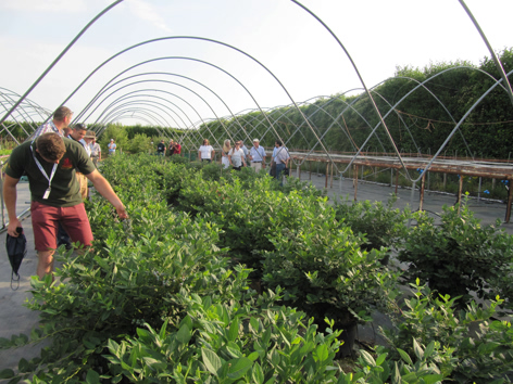Last on our visit to trial sites; the Blueberry trial. Blueberries grow best on a sunny site in sandy peat soil, but they also do well in heavy soils if they are well-drained, aerated, high in organic matter and receive adequate moisture. The most important requirement for growing blueberries is acidic soil.