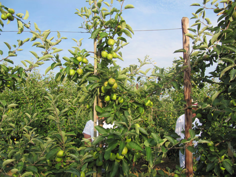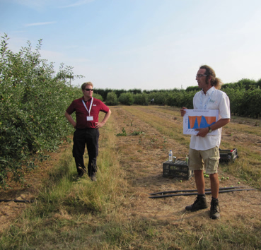 Below: left; FAST's Richard Killian outlines principles of bud reduction trial to attendees and right; Braeburn in trial plot
