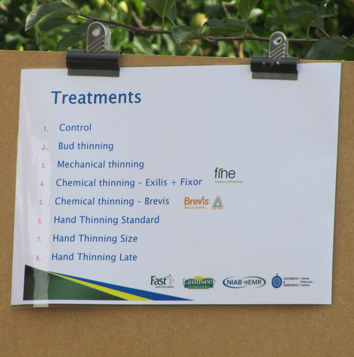 The treatments were: 1. A control (standard) for comparison. 2. Bud thinning. 3. Mechanical thinning. 4. Chemical thinning using Exilis + Fixor. 5. Chemical thinning using Brevis. 6. Hand thinning using standard process. 7. Hand thinning to size. 8. Hand thinning late.