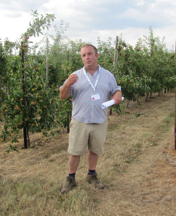 Below: James Shillitoe outlines the principles of Multi Stem trees where two leading branches are trained to be horizontal and a number of shoots trained upwards to form 'super spindle' fruiting units. The number can be 4, 6 or 8 super spindles. The objective is less trees per hectare (= less cost) and fruiting units (super spindles) which will need minimal pruning. In this trial, James has utilised Bibaum trees (2 leaders) and bent them to horizontal and selected new shoots to become the super spindle fruiting units.