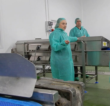 Below; left explaining the red room operation and right; packing prepared fruit