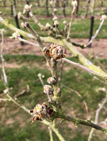 We had several touches of frost of -2c or -3c in the past week and I have seen damage on early varieties such as Red Windsor and in the more advanced buds in Bramley. It would appear to be not as bad as some orchards in Kent and East Anglia.