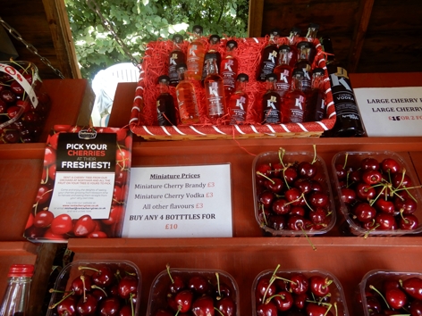 Below: left & right; Cherries and associated products on display. In addition to cherries, the EAM bought a bottle of Cherry Vodka