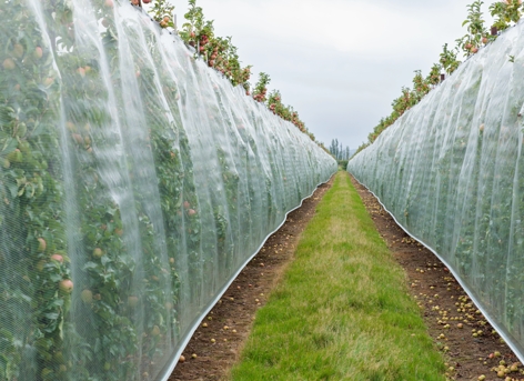 Below: left. John with a group inspecting Pink Lady and observing the hail netting