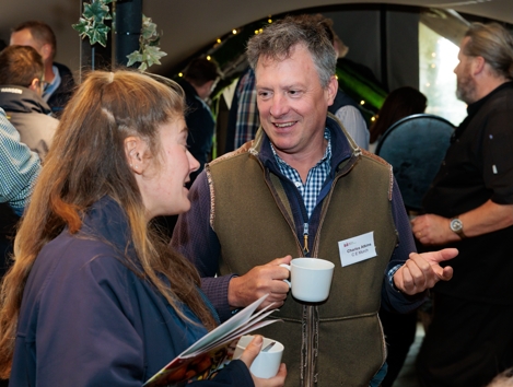 Below: Back from our orchard walk, we relax with a cup of tea. left. The EAM with Charnee Butcher of Worldwide Fruit and right. 'small group engaging in conversation'